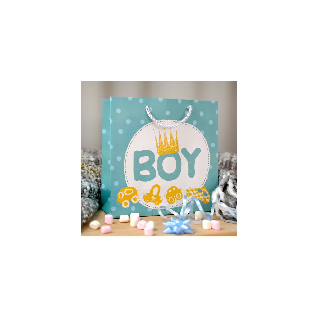 Štýlová detská darčeková taška pre chlapčeka v modrej farbe s nápisom BOY a motívom autíčok.