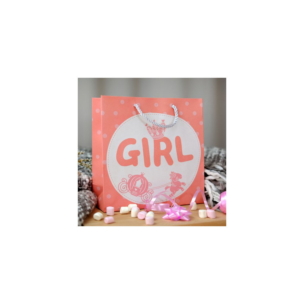 Štýlová detská darčeková taška pre dievčatko v ružovej farbe s nápisom GIRL a motívom koníka s kočiarom.