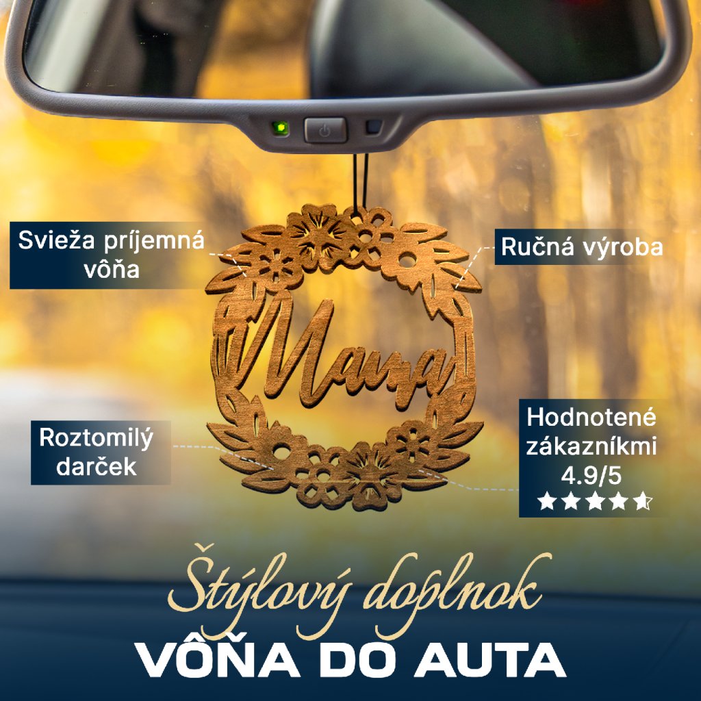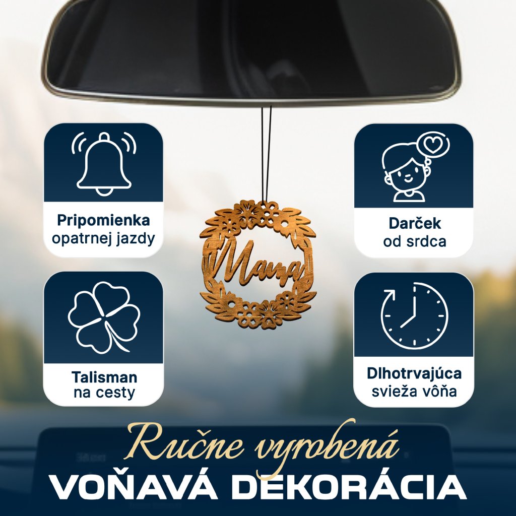 - Originálny drevený prívesok nie je len osviežovačom, ale aj štýlovým doplnkom a ochranným talizmanom na cesty.